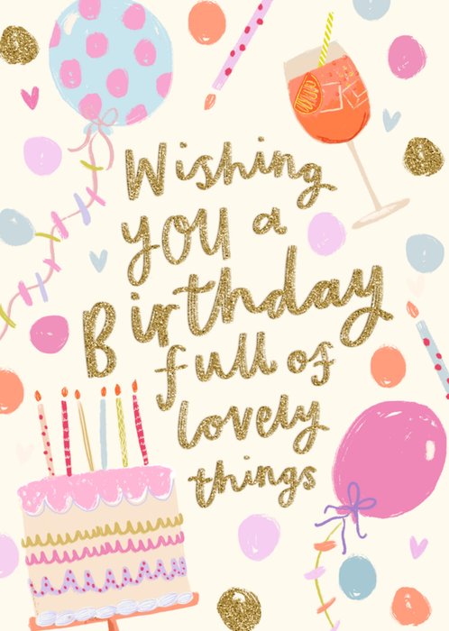 A modern design featuring gold glitter effect hand-lettering surrounded by pastel balloons, confetti dots, small hearts, a birthday cake with candles and a cocktail glass on a cream background