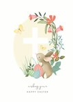 A beautifully illustrated Easter card featuring a soft pastel design with a bunny, decorated Easter eggs, butterflies, and floral accents surrounding a subtle white cross.