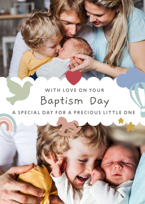 Featuring two large photo uploads framing a white scalloped panel containing delicate baby themed icons and an editable message in grey.