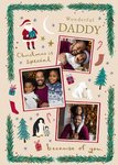 A cheerful Christmas-themed design with pine garlands around the border, featuring illustrated elements such as Santa Claus, penguins, polar bears, stockings, presents, candy canes, and stars. The background is a warm cream tone. The front includes three rectangular photo upload frames bordered in red for personal photos.