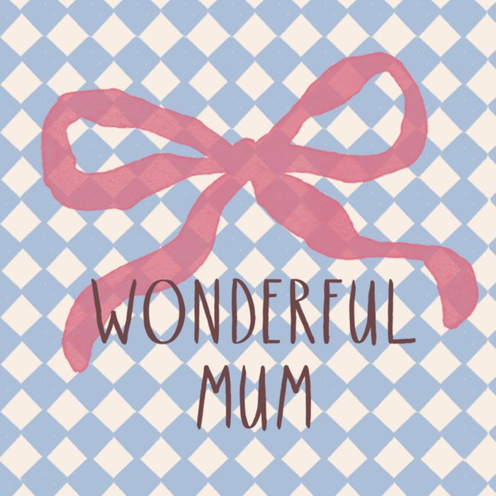 Featuring a greeting card with a large pink ribbon bow across the top, bold hand-drawn lettering in the centre, and a blue and cream diamond check pattern background.