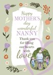Front of card: Central text verse, surrounded by a floral frame and a photo upload area below, on a sage green background. Text reads: "Happy Mother's Day wonderful Nanny. Thank you for filling our hearts with love."