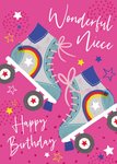 Features a bright, colourful design of an illustrated pair of roller skates with a rainbow and star pattern. The skates are on a pink background surrounded by stars and pink dots. At the top and the bottom of the card is white, handwritten style text.