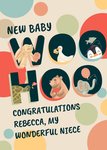 "New baby woo hoo congratulations Rebecca, my wonderful niece". 'New baby' and 'congratulations Rebecca, my wonderful niece' can be personalised!