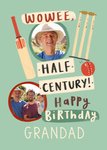 A soft, hand-drawn design featuring two round photo upload frames surrounded by a cricket themed Birthday message and bat, wicket & ball illustrations. The card has a soft green background.