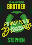 Front of card: Xbox Power Your Dreams Birthday Card Bold typography with an Xbox logo. Text reads: "To an awesome brother power your dreams Stephen". 'Brother' and 'Stephen' can be personalised!