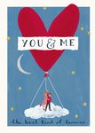 Featuring an illustrated couple standing on a white cloud holding a heart-shaped balloon. In the centre of the heart are the words "You & Me". With a crescent moon and gold stars on a blue background.