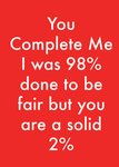 This greeting card design features bold white text against a vibrant red background with the humorous phrase, “You complete me. I was 98% done to be fair but you are a solid 2%,” creating a playful and witty message about love and relationships.