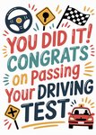 A bold typographic design featuring colourful text against a crisp white background with driving themed icons and dashes.