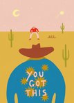 Featuring a bold and motivational vibrant illustration of a cowboy wearing a blue jacket decorated with the encouraging phrase "You got this" standing off against another cowboy, all on a western, desert-themed background.