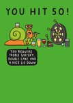 A hilarious illustrated 50th birthday card featuring a snail playing darts, celebrating the milestone with whisky, cake, and a much-needed rest. The playful wordplay makes it a great choice for anyone with a sense of humour turning 50.