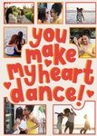Front of card: You Make My Heart Dance! Photo Upload Valentine's Day Card Bold 3D typography with seven photo frames. Text reads: "You make my heart dance!"