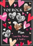 Front of card: Featuring five heart shaped photo frames surrounded by hearts on a black background. Text reads: "You rock Mam love Adie, Marlow