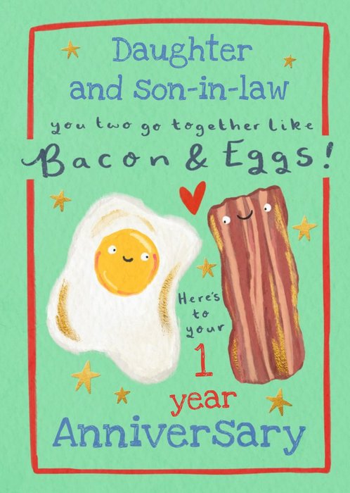 "Daughter and son-in-law, you two go together like Bacon & Eggs! Here's to your 1 year Anniversary". 'Daughter and son-in-law' and '1 year' can be personalised!