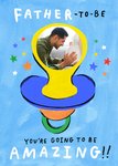 A bright and cheerful Father's Day card for a dad-to-be, featuring a colourful illustrated dummy on a light blue background with scattered stars. At the top, the hand-lettered message celebrates a father-to-be, while a photo upload frame is cleverly positioned within the top of the dummy. A joyful and uplifting design for expectant dads.