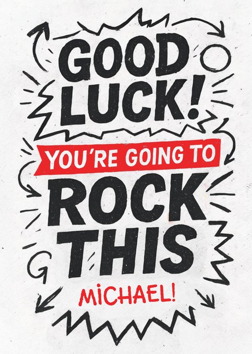 A modern design featuring bold black and red typography with hand-drawn arrows and lightning, plus a personalised name area on a white textured background.