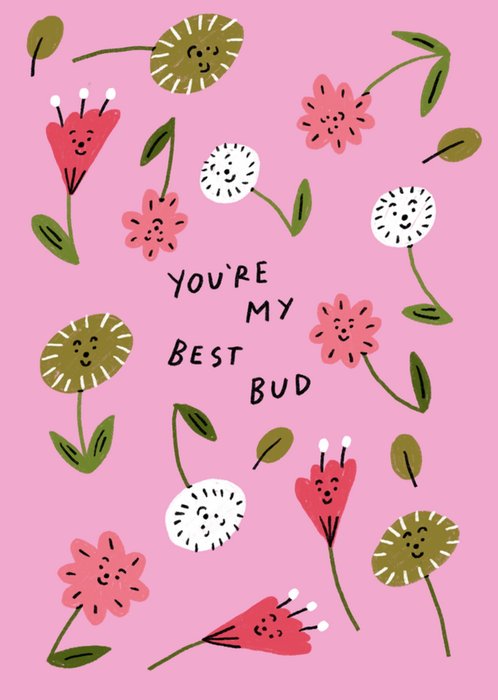 Featuring illustrations of smiling flowers on a pink background with black hand-lettered text in the centre.