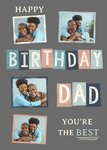 Front of card: Featuring a collage of 4 photo upload frames on a grey background with pastel-coloured blocked text. Text reads: "Happy birthday dad, you're the best".