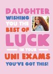 This card features a cheerful and supportive message for a daughter, wishing her the best of luck in her university exams. The design includes colorful text and a photo upload area.