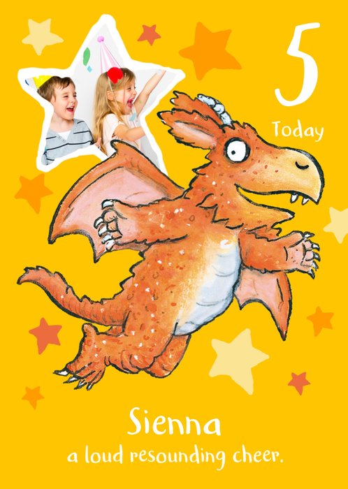 Featuring Zog, an illustrated orange dragon with wings, flying through the air surrounded by stars and a star-shaped photo frame on a yellow/orange background.