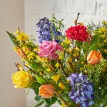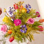 Created especially for our exclusive collection, this bouquet is bursting with beautiful blue delphiniums, red and orange tulips, dressed with silky greenball and carnations. Hand-arranged by our expert florists, it comes lovingly presented in vibrant red tissue. Complete with the Cath Kidston Stoneware Floral Jug, this gift is the perfect way to brighten someone's day (and home!).