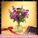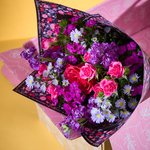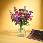 With cerise roses, purple stocks and alstroemeria, this bunch is bold, bright and bursting with feel-good energy. Balanced with soft pink dianthus and a pop of red limonium, it’s the kind of bouquet that turns any day into a special one.