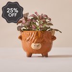 With its round nose and its shaggy wavy mane, this charming highlander cow pot has been teamed with the striking pink leaved Fittonia to make a winning combination. This makes a unique gift for any avid plant or cow lover. Wait for the plant to wilt a little before re-watering and situate in a bright environment.