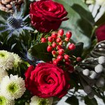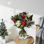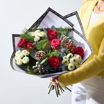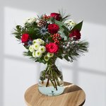 Bursting with festive colour, this beautiful NEXT bouquet brings together rich red roses, soft white santini and frosted pinecones. Finished with silvery brunia, blue eryngium and winter greenery, it’s a fresh and timeless way to add a little Christmas magic to their home.