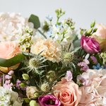 Blush pink hydrangeas and peach roses create a delicate, romantic feel in this hand-tied bouquet. Mixed with white stocks, lisianthus and touches of soft blue, it’s an elegant arrangement that feels fresh and full of charm.