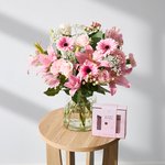 Pastel roses, pink germini and alstroemeria come together in this bouquet for a soft, romantic mix. Accented with gypsophila and lush foliage, it’s an arrangement full of gentle charm.