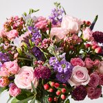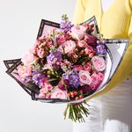A dreamy mix of pastel roses, lilac stocks and freesia, this bouquet is full of soft colour and delicate fragrance. With accents of peach hypericum and raspberry scabiosa, it’s a fresh and uplifting arrangement that feels effortlessly elegant.