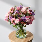 A dreamy mix of pastel roses, lilac stocks and freesia, this bouquet is full of soft colour and delicate fragrance. With accents of peach hypericum and raspberry scabiosa, it’s a fresh and uplifting arrangement that feels effortlessly elegant.