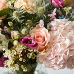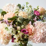 Blush pink hydrangeas and peach roses create a delicate, romantic feel in this hand-tied bouquet. Mixed with white stocks, lisianthus and touches of soft blue, it’s an elegant arrangement that feels fresh and full of charm.