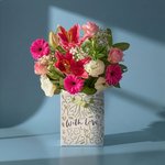 A medley of playful pinks and tasteful neutral tones – this bouquet is the epitome of elegance. Featuring bright and cheery cerise germini, pink daises, white gypsophilas, pink antirrhinums and pink lilies, this arrangement comes hand arranged by our skilled florists.