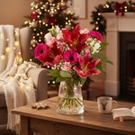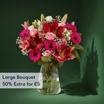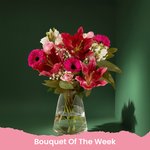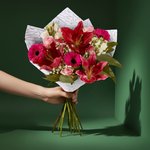 A medley of playful pinks and tasteful neutral tones – this bouquet is the epitome of elegance. Featuring bright and cheery cerise germini, pink daises, white gypsophilas, pink antirrhinums and pink lilies, this arrangement comes hand arranged by our skilled florists.
