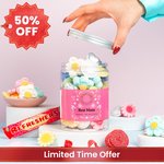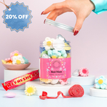 "Triple Hearts: Glucose Syrup, Sugar, Gelatine, Acids (Citric Acid, Lactic Acid), Gelling Agent (Pectins), Flavourings, Colours (E102, E129, E133). Jelly Flowers: Glucose Syrup, Sugar, Water, Gelatine (Pork), Acids (Lactic Acid, Malic Acid, Citric Acid), Gelling Agent (Pectins), Flavourings, Plant & Vegetable Concentrates (Black Carrot, Spirulina, Safflower), Colours (E100, E160c), Vegetable Oil (Coconut), Glazing Agent (Carnauba Wax). Mallow Flowers: Sugar, Glucose-Fructose Syrup, Water, Gelatine (Pork, Beef), Flavourings, Colours (E100, E120, E133), Maize Starch. Fizzy Rolls: Sugar, Glucose-Fructose Syrup, WHEAT Flour, Acids (Malic Acid, Citric Acid), Palm Fat, Dextrose, Corn Starch, Flavouring, Antioxidant (Ascorbic Acid), Acidity Regulator (Potassium Citrates), Salt, Colour (E120). Love Heart Roll: Sugar, Acidity Regulator (Malic Acid), Anti-Caking Agents (Stearic Acid, Magnesium Stearate, Magnesium Carbonate), Sodium Bicarbonate, Modified Starch, Flavourings, Colours (E163, E162, E141, E100, E161b, E160c). Strawberry Flavour Refresher: Glucose Syrup, Sugar, Vegetable Oils (Palm, Palm Kernel), Acidity Regulator (Citric Acid), Modified Starch, Anti-Caking Agents (Stearic Acid, Magnesium Carbonate, Magnesium Stearate), Flavourings, Lysed SOYA Protein, Emulsifier (Glycerol Mono Stearate), Colour (E163). WARNING: E102 and E129 May have an adverse effect on activity and attention in children"Allergies: All customers and recipients should ensure they have read the product information carefully, especially if a recipient has any allergies.