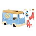 Get ready to serve up some fun in Bluey's Food Truck Playset. This transforming playset is loaded with tons of features. Roll into the market in the Food Truck, then open the playset out to transform the van into a café with dining area and chairs. Flip up the roof of the truck to reveal the yummy menu. The Food Truck playset includes an exclusive 3-inch (7.6 cm) figure of Bluey wearing her apron and visor. With articulated arms and legs, she's perfect for play and posing. Children can sit their other Bluey figures in the chairs as Bluey serves up the most delicious food - maybe a burger and drinks? And would you like fries with that?
