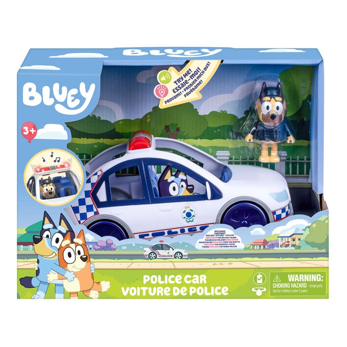 Bring Bluey’s world to life with this fun new vehicle. The Bluey Police Car includes a police car with lights & sounds, Policeman figure, and a themed sticker set. Features flashing lights & siren sounds