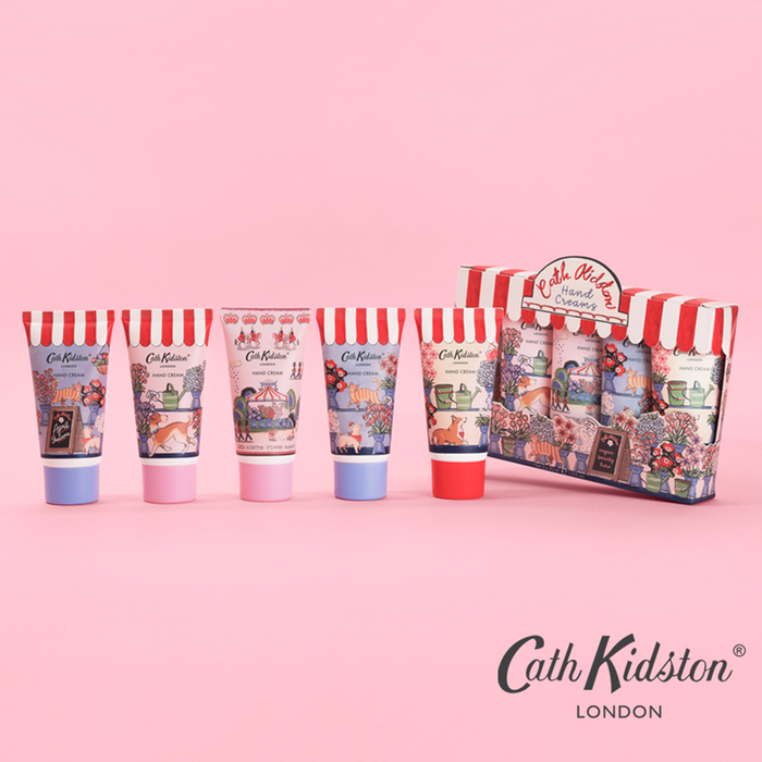 The flower market is open! A perfect giftable set of five assorted hand creams in a jolly carton with hand painted illustrations of our Cath Kidston Flower Market stall, complete with signature red and white awning.