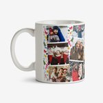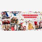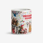 Mug design: Featuring 9 photo uploads surrounded by scattered festive confetti illustrations & white text within a red banner, all on a white background.br> Text reads: "A cup of cheer. From all of us!"