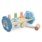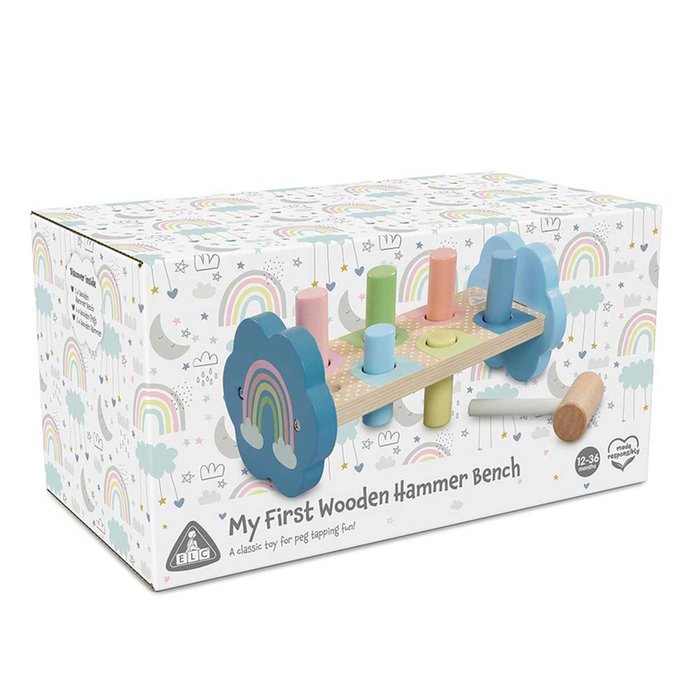 Get hammering with the My First Hammer Bench from Early Learning Centre. This sturdy wooden Hammer Bench is designed in pastel colours with polka dots and rainbows for visual stimulation. Simply use the hammer to knock the pegs through the holes before turning the bench over to start all over again.