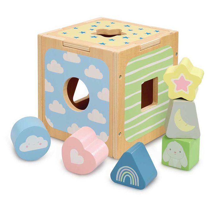 Introducing the My First Wooden Shape Sorter from Early Learning Centre. This pastel Shape Sorter has chunky wooden shapes featuring sweet designs for baby to post through the matching holes. Introduce concepts such as hand eye coordination and fine motor skills while keeping baby entertained. When they’re finished, lift the lid to retrieve the blocks and start all over again or leave them inside for tidy storage.