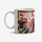 Featuring a cheerful red and green diagonal striped background with a single rectangular photo upload frame on the left. On the right, bold green and red text appears on a holographic-style background.
