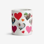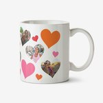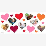 Featuring six heart-shaped photo areas surrounded by red, pink, orange, and burgundy hearts on a white background.