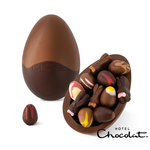 x1 Thick chocolate egg: half milk-dark, half hazelnut praline, packed with truffles, pralines, caramels, in a recyclable at home packaging.