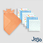 Make bath time and everyday clean-ups extra cute with this practical duo. The super-soft cotton Crab Hooded Towel features an adorable crab face with 3D claws and a cosy hood to help keep chills away and dry little ones quickly. Pair it with a handy 6-pack of lightweight, absorbent muslins in a new softer cotton mix with bold shapes and stripes—perfect for feeding, burping, spills and wiping delicate skin.