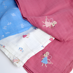 Muslin cloths are a must-have when you have a little one. Our 5-Pack Fairy Mouse Embroidered Muslins now come in a new, softer mix that is guaranteed to soothe your child. They'll come in handy for mopping up spills, protecting your clothes when feeding or burping your baby and wiping delicate skin. Super soft, gentle, and absorbent, our JoJo muslins balance sweet prints with practicality. • 5-Pack set with fairy mouse, plain pink and star prints