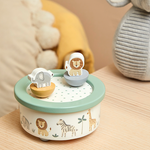 Make a soothing bedtime routine with the Safari Music Box. Twirling elephants and lions sit atop the music box with more charming animal characters all around. Wind it up to play a delicate tune that little ones will love to listen and move to. Ideal for a safari-themed nursery or playroom.