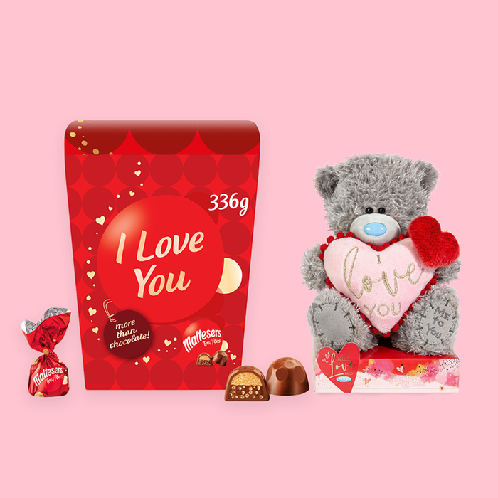 The perfect gift to say 'I love you'. Give a gorgeous Valentine's surprise with this cute Tatty Teddy holding a heart edged with a pop-pom frill. Paired with a chocolate treat of Maltesers Truffles with a 'I Love You' Box.