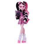 Draculaura doll stuns in a pink bow dress and black cardigan with pigtails, heart earrings, and cozy leg warmers. Doll comes with accessories including a purse, iCoffin phone, lipstick, ramen bowl, and more. Includes her beloved pet bat Count Fabulous, wearing a matching bow for the ultimate monster duo look